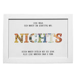 „Ich wünsche mir nichts“ – Wie oft haben wir das schon gehört uns sind beinahe wahnsinnig geworden! Wie viel Zeit und Mühe mussten wir aufbringen, um deshalb allein nach einem passenden Geschenk zu suchen? Und wie oft haben wir es gefunden? Mit diesem Aufwand ist jetzt Schluss. Von nun an nimmst Du den Beschenkten beim Wort! Was ist dieses Nichts? Wo kann man es kaufen? Was willst Du damit? Wir haben die Antwort! Das Nichts ist ein Wandbild, indem man sein Geldgeschenk perfekt platzieren kann. Mit dem „Nichts“ kann sich der Beschenkte kleine oder große Wünsche erfüllen. Das Nichts wird ihn oder sie garantiert zum Schmunzeln bringen! Du bist auf der Suche nach einem kreativen Geschenk für jemanden, der sich „Nichts“ wünscht? Hiermit hast Du es gefunden!
