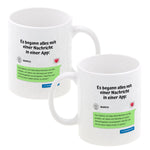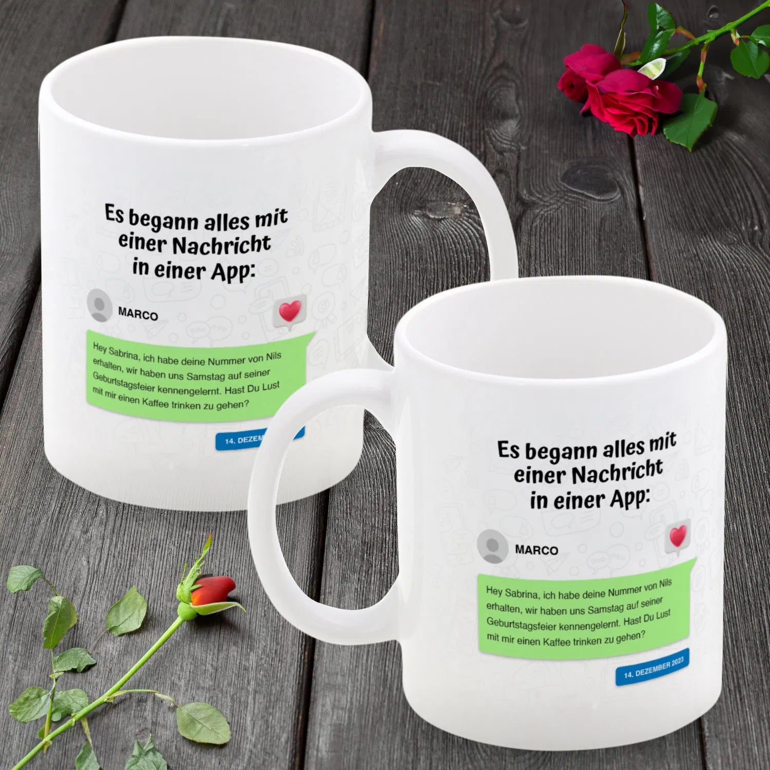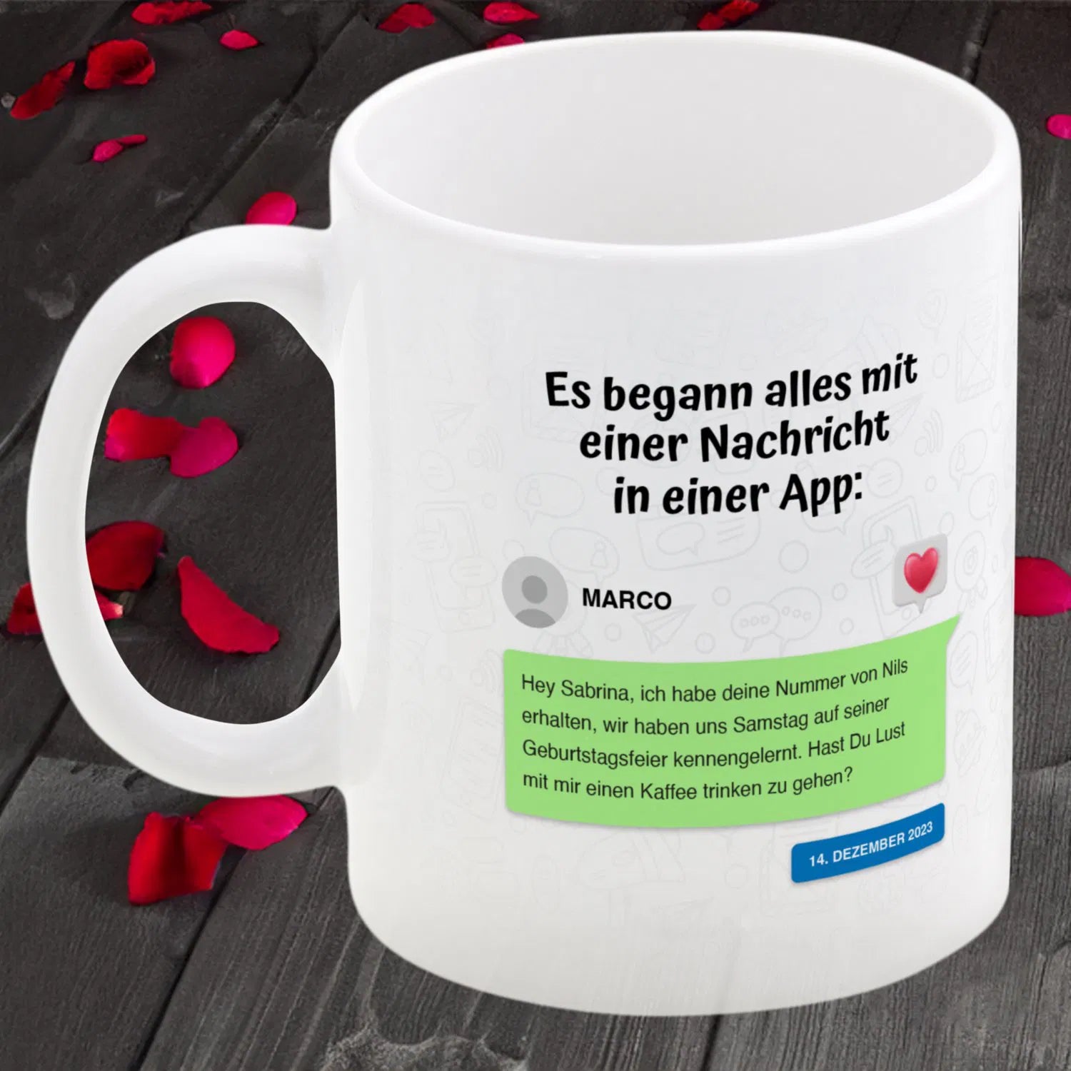 Jeder Liebesweg beginnt irgendwo, und oft ist es eine kleine Geste, die den Funken entzündet. Erinnerst Du Dich an die erste Nachricht, die Euch beide auf eine Reise der Liebe schickte? Mit unserer "Es begann mit einer Nachricht"-Tasse kannst Du diese besondere Botschaft für immer festhalten, ganz gleich, auf welcher App sie geschrieben wurde.