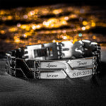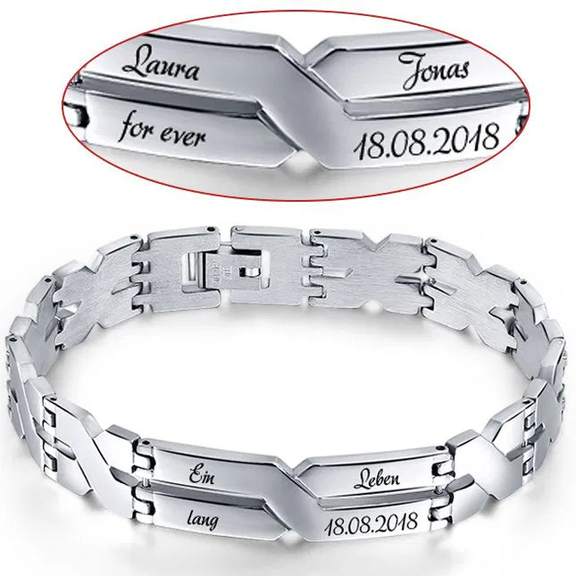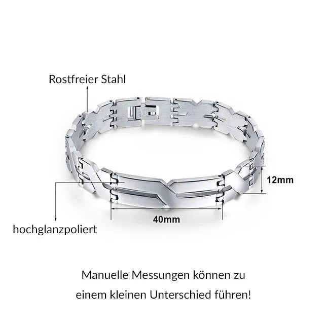 Das edle Armband aus Edelstahl ist bei uns in fünf verschiedenen Längen erhältlich. Es hat eine Breite von 1,2 cm. Kleiner Tipp: Wenn Du unsicher bist, welche Länge für den Beschenkten passend ist, wähle eine längere Variante. Das Armband kann beim Juwelier oder Uhrmacher jederzeit gekürzt werden. Für Deine persönliche Botschaft stehen Dir insgesamt vier Felder zur Verfügung. Diese werden nach Deinen Wünschen mit je bis zu 12 Zeichen graviert. Hier kannst Du beispielsweise ein bedeutsames Datum, Namen oder einen kurzen Spruch verewigen. Dadurch wird dieses romantische Geschenk zu einem Unikat!