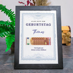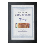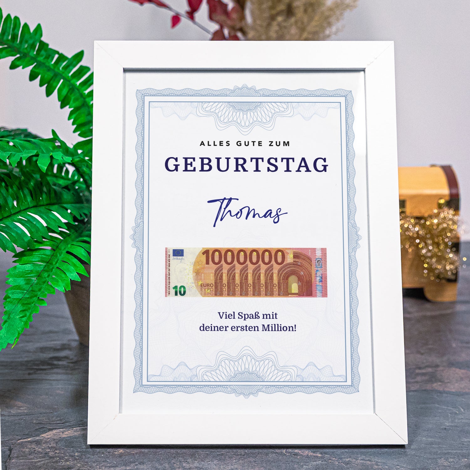 Feiere den besonderen Geburtstag mit einem einzigartigen Geldgeschenk: diesem kreativen Wandbild zur "Ersten Million". Platziere sechs gefaltete 10-Euro-Scheine, die zusammen eine Million symbolisieren. Personalisiere das Bild mit dem Wunschnamen – so wird es zum fröhlichen Hingucker an jeder Wand. Wähle zwischen verschiedenen Rahmenfarben oder ganz ohne Rahmen für den perfekten Look. Ein originelles Geschenk, das Freude und Überraschung garantiert!