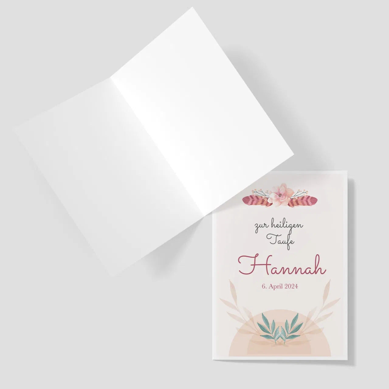 Unsere Grußkarte zur heiligen Taufe im Boho Style ist nicht nur eine herzliche Botschaft, sondern auch eine wunderschöne Ergänzung zu jedem Taufgeschenk. Das florale Design verleiht ihr einen besonderen Charme und macht sie zu einem zeitlosen Erinnerungsstück. Durch die Möglichkeit, den Namen und das Datum des Täuflings hinzuzufügen, wird die Karte zu einem individuellen und persönlichen Geschenk. Zeige Deine Liebe und Wertschätzung für den kleinen Täufling.