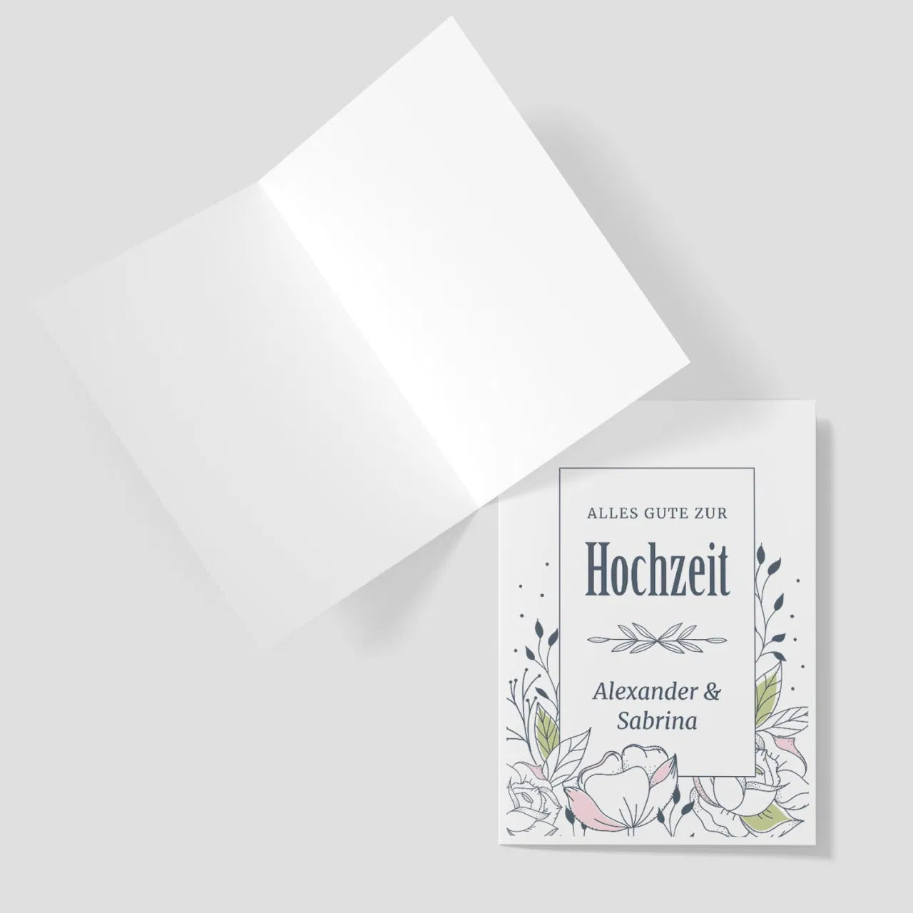 Die Klappkarte im Format 10,5 x 14,8 cm präsentiert ein zauberhaftes florales Design, das die Liebe und Romantik des Hochzeitstages perfekt einfängt. Die Innenseite der Karte ist blanko und bietet ausreichend Platz für Deine eigenen Glückwünsche und Gedanken. Gestalte sie ganz nach Deinem Geschmack und verleihe Deinem Geschenk eine persönliche Note, die von Herzen kommt.