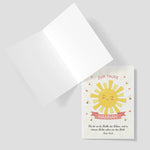 Überrasche die Eltern des Täuflings mit einer liebevollen Geste, die ihren Tag noch sonniger macht. Unsere Grußkarte zur Taufe mit einem zauberhaften Sonnenmotiv ist genau das Richtige, um Deine Glückwünsche auf warmherzige Weise zu übermitteln. Die strahlende Sonne auf der Vorderseite versprüht Freude und Optimismus und macht diese Karte zu einem besonderen Blickfang.